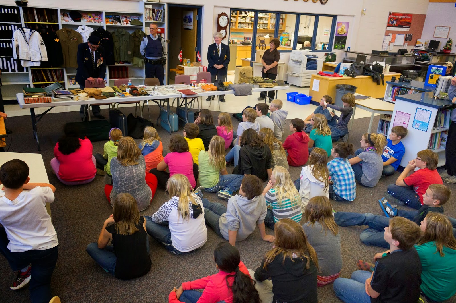 My Great Uncle Charlie Fielding served during WWII. He has travelled for years to schools in and around Hanna speaking to kids, showing them his uniforms, medals, memorabilia and whatever else he can bring for them.